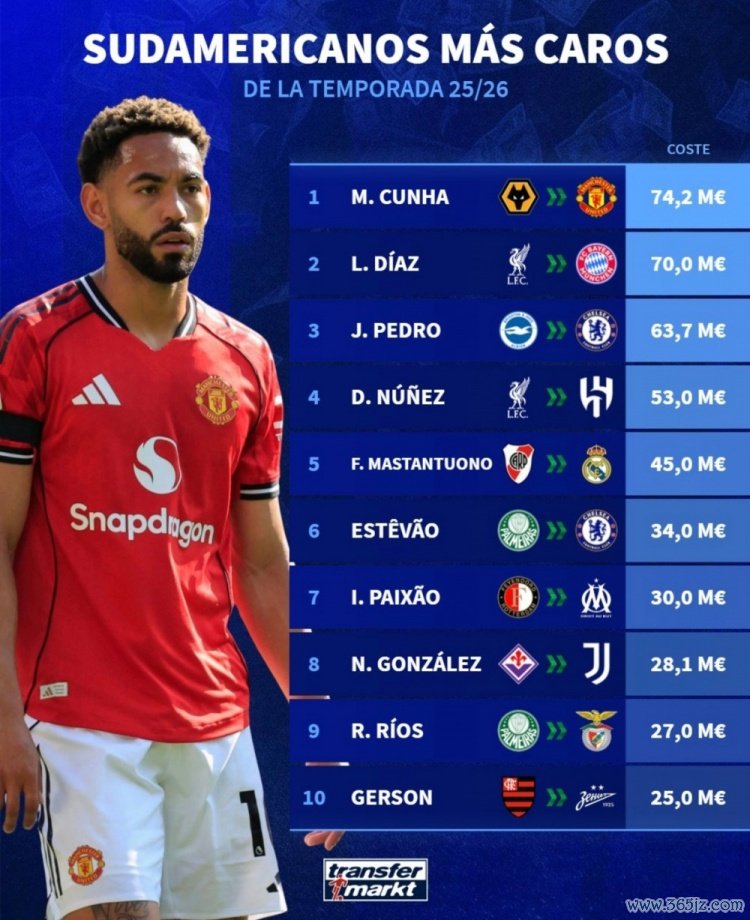 8月26日讯 转会市场盘点了今年夏窗截至目前南美球员转会费榜单,其中库尼亚居首,