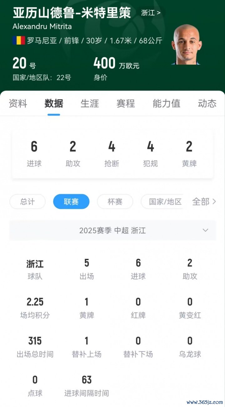 近3轮中超,米特里策更是连续为球队取得得分 ,包括上轮职业联赛 对三镇的致胜球 得分 ,成为了浙江队近期取得中超3连胜的绝对功臣。