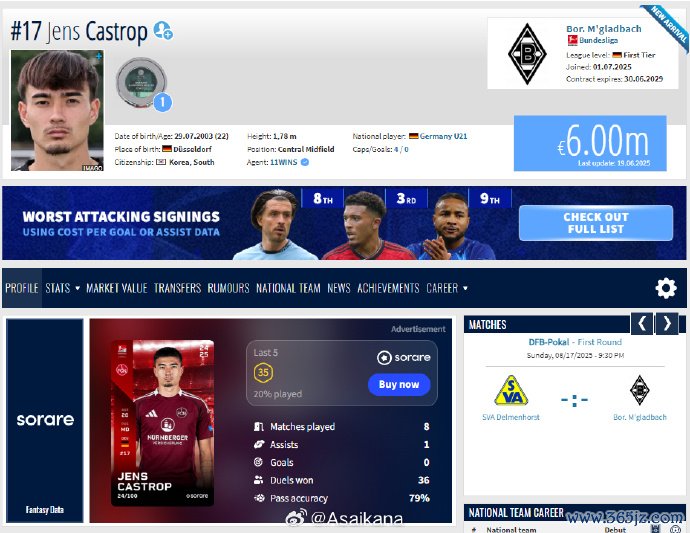 卡斯特罗普今年22岁,司职中场球员,畅游运动天地曾入选过德国多个年龄段的青少年代表队。他的父亲是德国人, 乒乓球直播吧母亲是来自韩国的移民, 皇家马德里球员从小在德国出生,并在杜塞尔多夫、科隆参加青训。今夏刚刚从纽伦堡加盟门兴,目前德回转 价600万欧元。