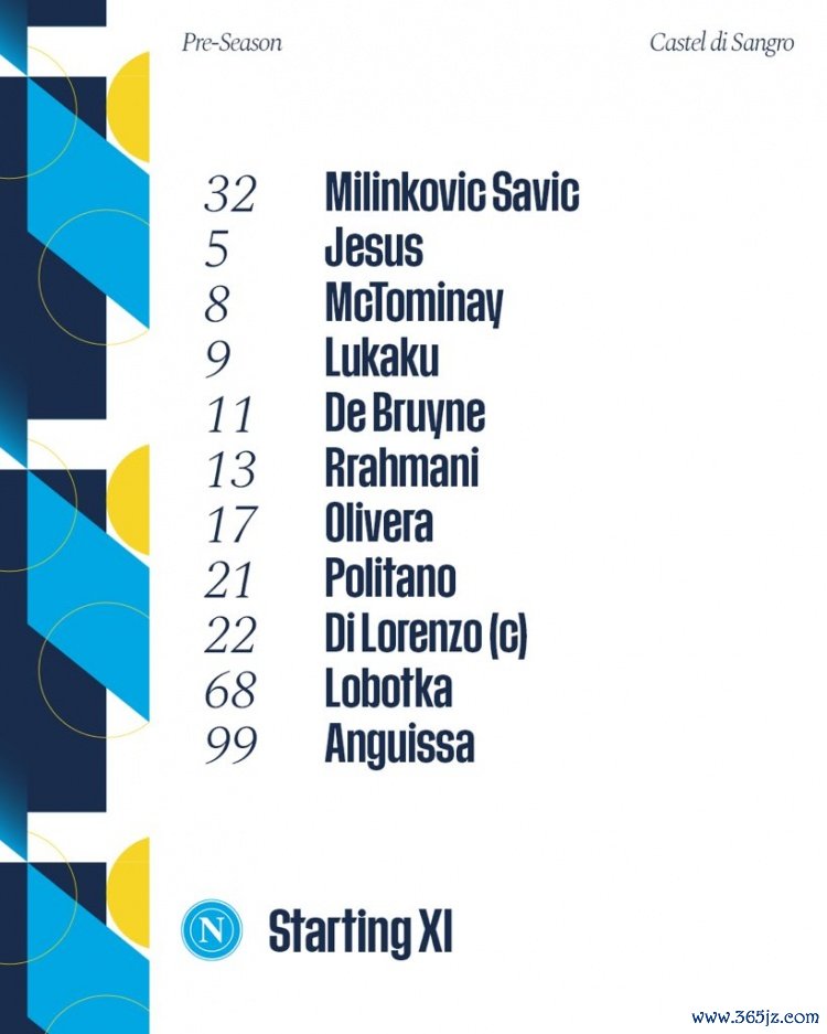 那不勒斯杆位:32-瓦尼亚-米林科维奇-萨维奇、5-胡安-热苏斯、8-麦克托米奈、9-卢卡库、11-德布劳内、13-拉赫马尼、17-马蒂亚斯-奥利维拉、21-波利塔诺、22-迪洛伦佐、68-洛博特卡、99-安古伊萨