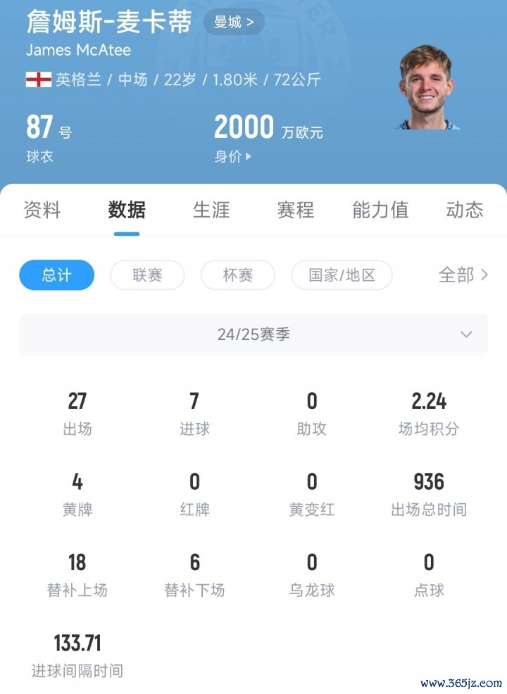 22岁的英格兰中场球员麦卡蒂, 皇家马德里上赛季代表曼城出战27场赛事 ,打入7球,目前麦卡蒂的德回转 价为2000万欧元。