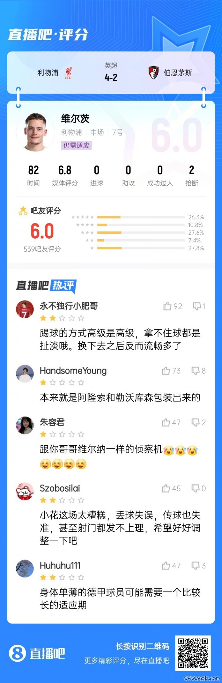 08月16日讯 利物浦迎来新赛季英超揭幕战,主场作战 4-2击败伯恩茅斯,1.25亿欧新援维尔茨表现一般,媒体评分6.8,吧友评分6分。