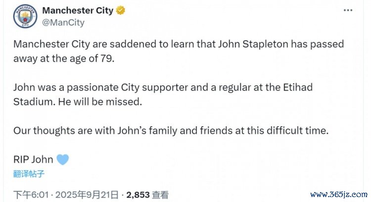 曼城官方社媒写道:“曼城俱乐部沉痛获悉,约翰-斯特普尔顿辞世,畅游运动天地享年79岁。”