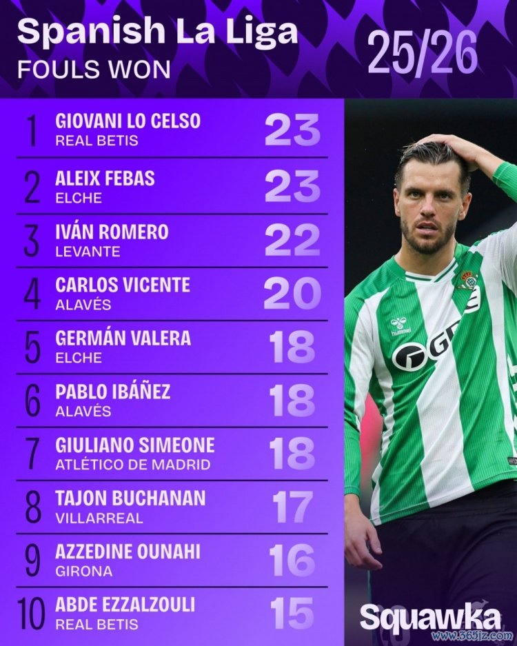 10月7日讯 日前,Squawka统计了本赛季西甲被违例 次数排行,