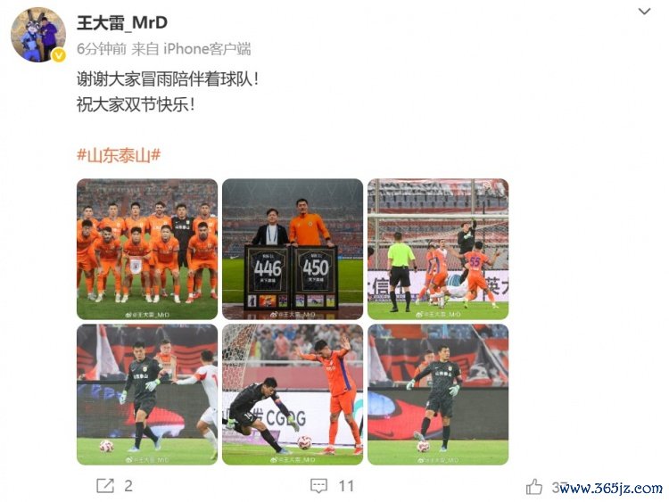 赛后中超直播, 皇家马德里王大雷更新社媒总结赛事 ,他晒出多张赛事 图,同时配文:谢谢大家冒雨陪伴着球队!祝大家双节快乐!