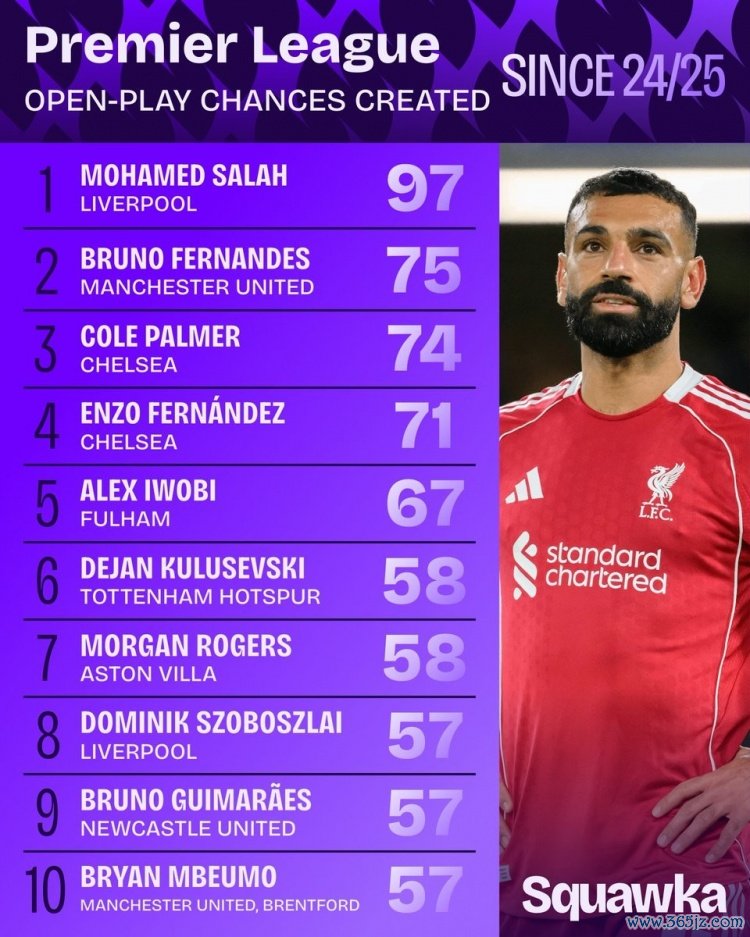 10月16日讯 日前,Squawka统计了24/25赛季以来英超运动活动 战创造机会次数排行,