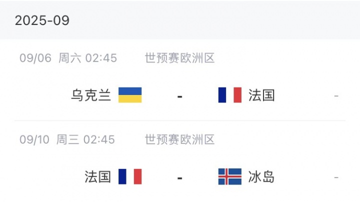 法国国家队将在9月的世欧预中对阵乌克兰和冰岛,小组第一名将直接晋级下一轮 2026年世界杯赛 。